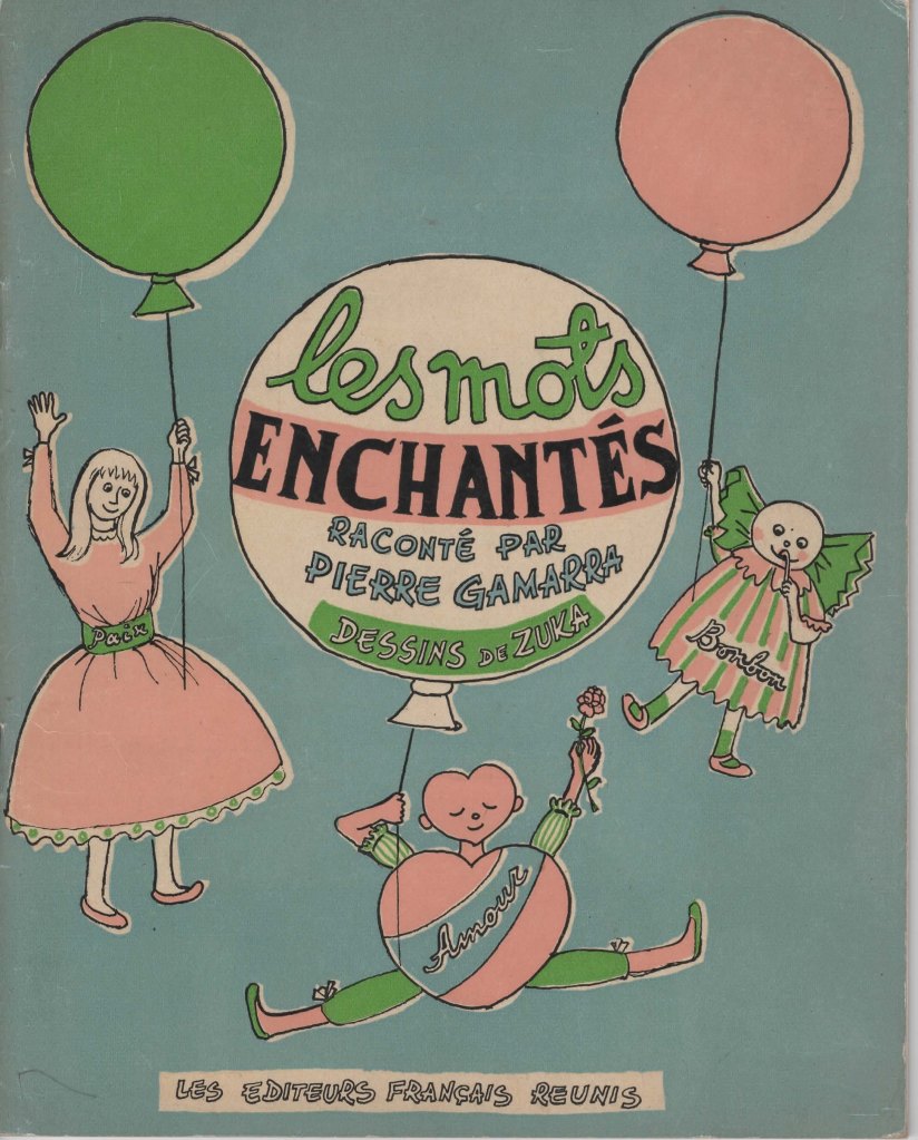 En 1952, c’est un autre conte, Les mots enchantés, qui est édité par les Editeurs Français Réunis, avec des dessins de Zuka (1924-2016), artiste américaine installée à Paris depuis 1948. En voici un extrait, où le pacifisme de l’auteur rejoint son goût pour une manipulation de la langue par le merveilleux (tel qu’il apparaîtra ensuite dans On a volé l’alphabet, par exemple) :