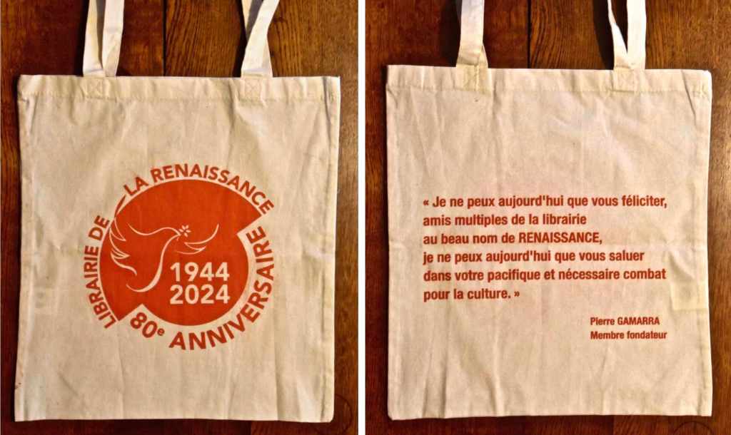La Librairie de la Renaissance, à Toulouse, fête ses 80 ans, en 2024. À cette occasion, ses animateurs ont fait fabriquer le sac de toile suivant :